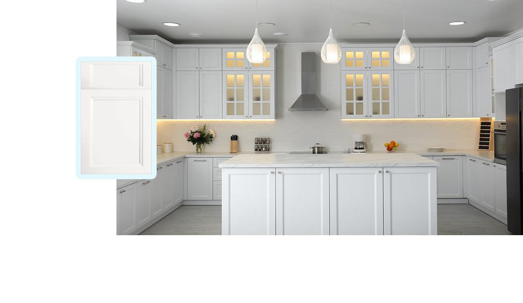 1/2” matching veneered plywood toe kick. 3/4″ five piece solid wood frame with MDF center panel based on selected style.